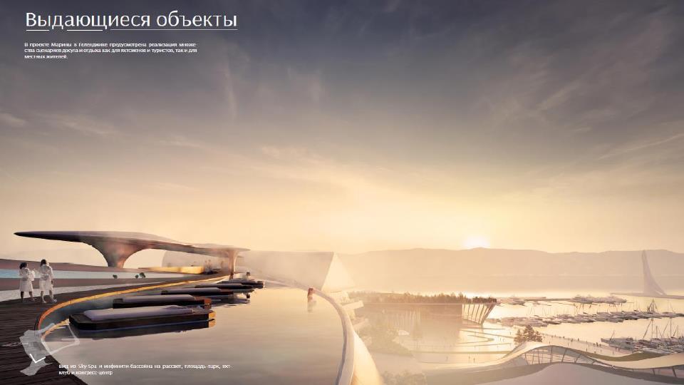 Особое внимание уделено созданию комфортной и интересной среды для отдыха. На территории марины появится отель с бассейном на крыше, а также уникальный водный театр – один из немногих в мире.
