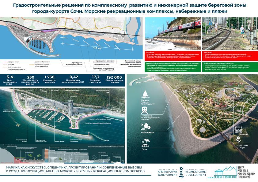 В заключение Ольга Шебзухова рассказала о пилотном проекте в Сочи – создании искусственного земельного участка с гостиничным комплексом и мариной на 250 яхт. Однако реализация этого проекта осложняется действием закона о сохранении лечебных пляжей.