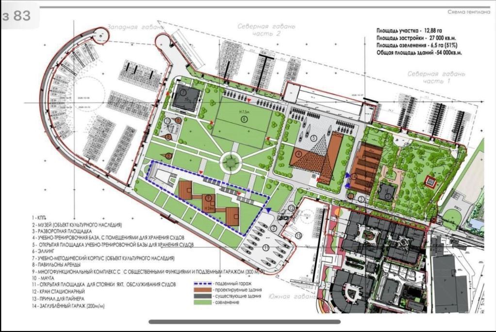 Главное здание яхт-клуба, которое является объектом культурного наследия регионального значения, будет использоваться как учебно-методический комплекс, еще один региональный памятник — Дом Ропса с садом — превратится в музей яхтенного спорта. Также на участке появятся эллинг, учебно-тренировочная база с помещениями и открытой площадкой для хранения судов, три павильона, предназначенные для сдачи в аренду, в том числе под рестораны и кафе, заглубленный гараж на 200 машино-мест. Вдоль южного берега участка разместится многофункциональный комплекс с общественными функциями и подземным гаражом на 300 машино-мест. В нем может разместиться гостиница для участников парусных соревнований.
