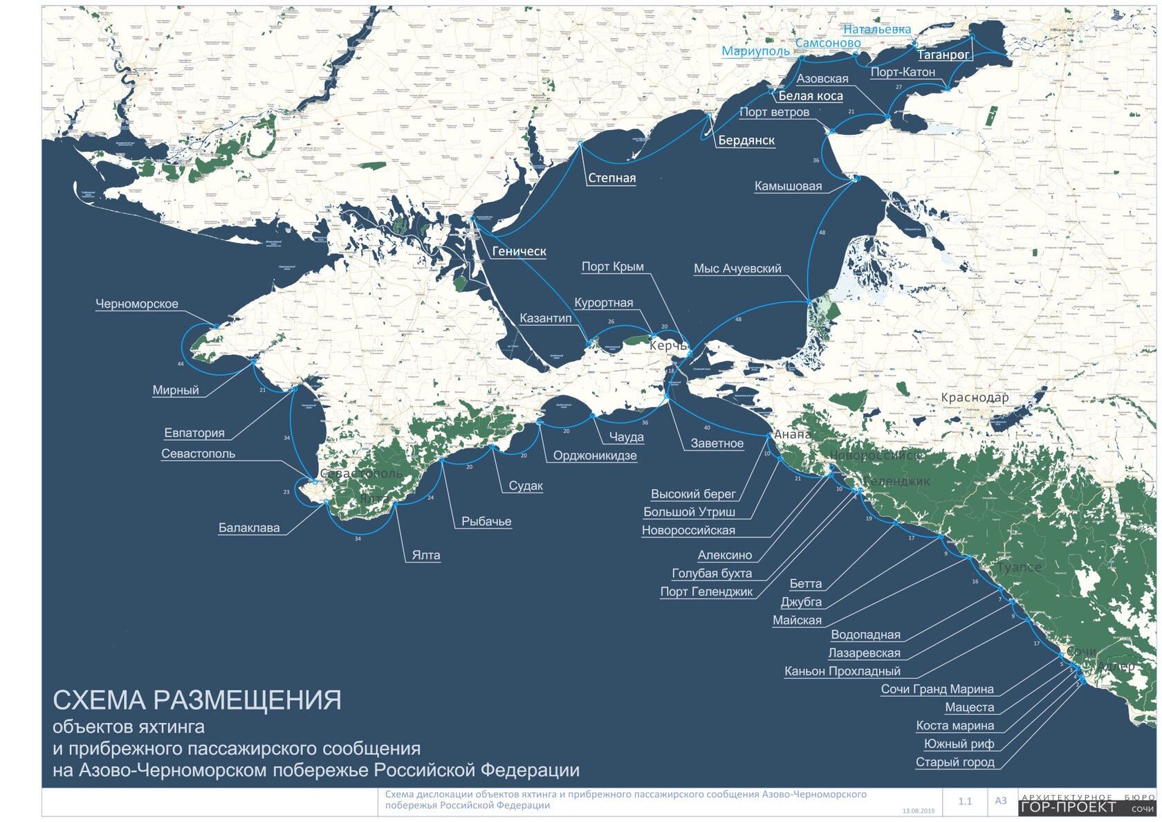 Чёрное и Азовское моря традиционно рассматривались как основа российского морского туризма, однако системный подход к развитию яхтенной инфраструктуры был утверждён только в 2023 году. В Краснодарском крае разработана и утверждена Концепция развития яхтенной инфраструктуры Азово-Черноморского побережья, которая легла в основу федеральной стратегии.